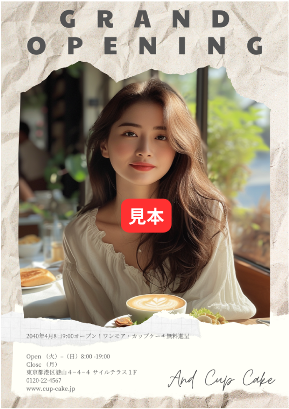見本の画像は、あくまでも見本です。ご希望のラフ案を送信フォームから提示していただければそのラフ案をもとにデザインいたします。または、こちらからデザインをメール等でご提案いたします。写真やイラストをご提供いただくか、必要に応じて当店でAI生成いたします。